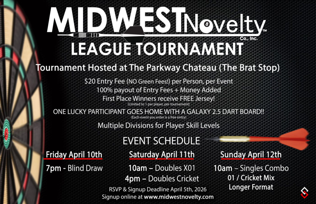 Signup Deadline is April 6th, 2026. Once again, we will not be collecting a Green Fee. So 100% of your $20 Entry Fee will be going to the Prize Pool. The dart boards will still be on Free Play.